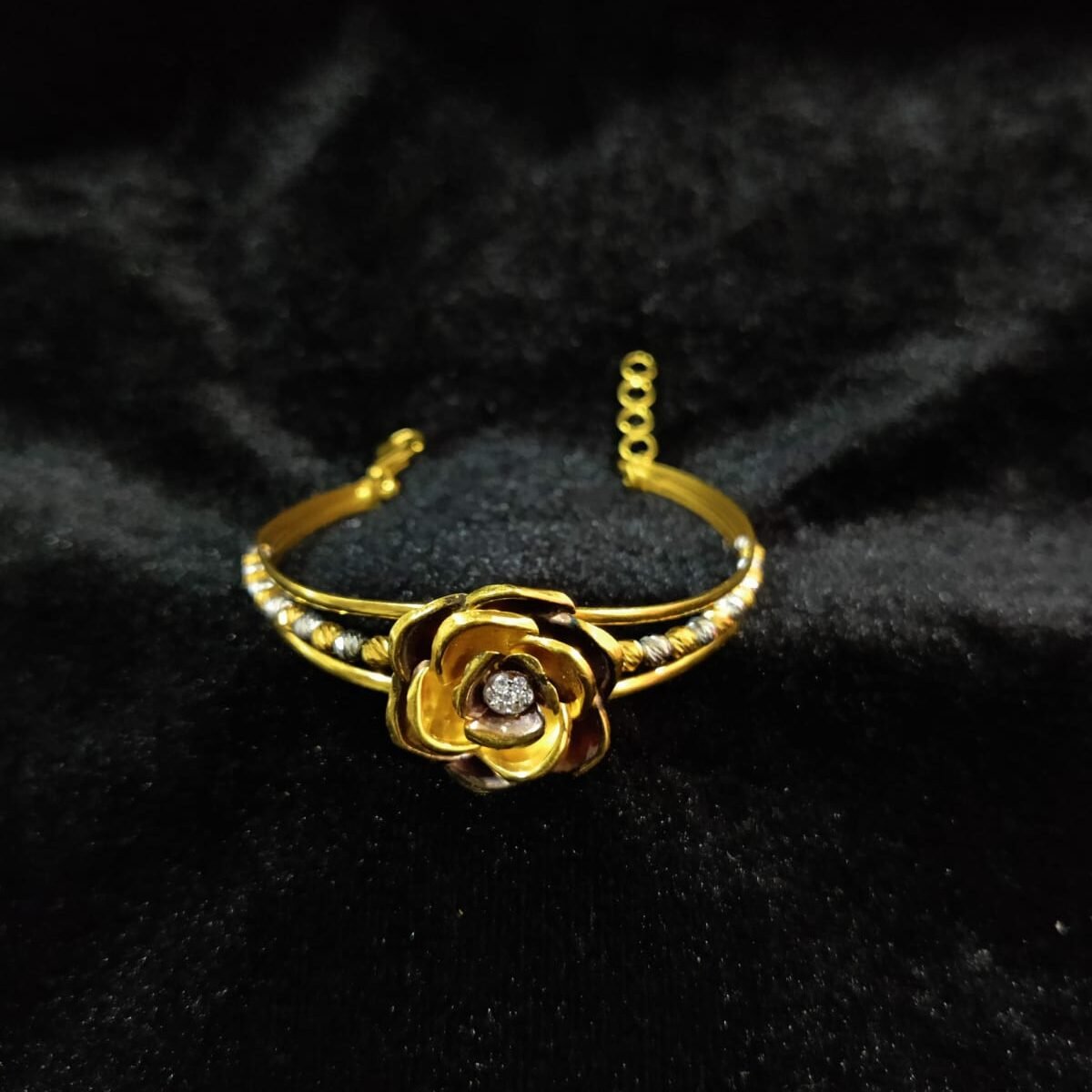 This elegant 12.79g bracelet is crafted in 22Kt gold, featuring a stunning rose flower design with a sparkling stone at the center. Its modern yet timeless style makes it perfect for both daily wear and special occasions, adding a graceful charm to your wrist.